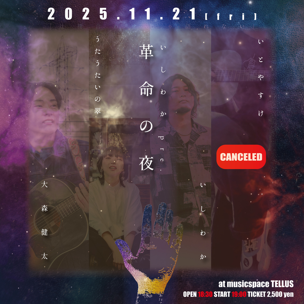 いしわかpre.「革命の夜」 SCHEDULE 2025/11/21(金) 18:30 - 2025年11月21日 (金) いしわかpre.「革命の夜」 ◇PLACE musicspace TELLUS ◇ACT いしわか うたうたいの翠 いとやすけ ※キャンセル大森健太 ◇OPEN 18:00 ⇒ 18:30 ◇TICKET ¥2,500 ◇STREAMING OFFLINE URLをコピーする 報告する