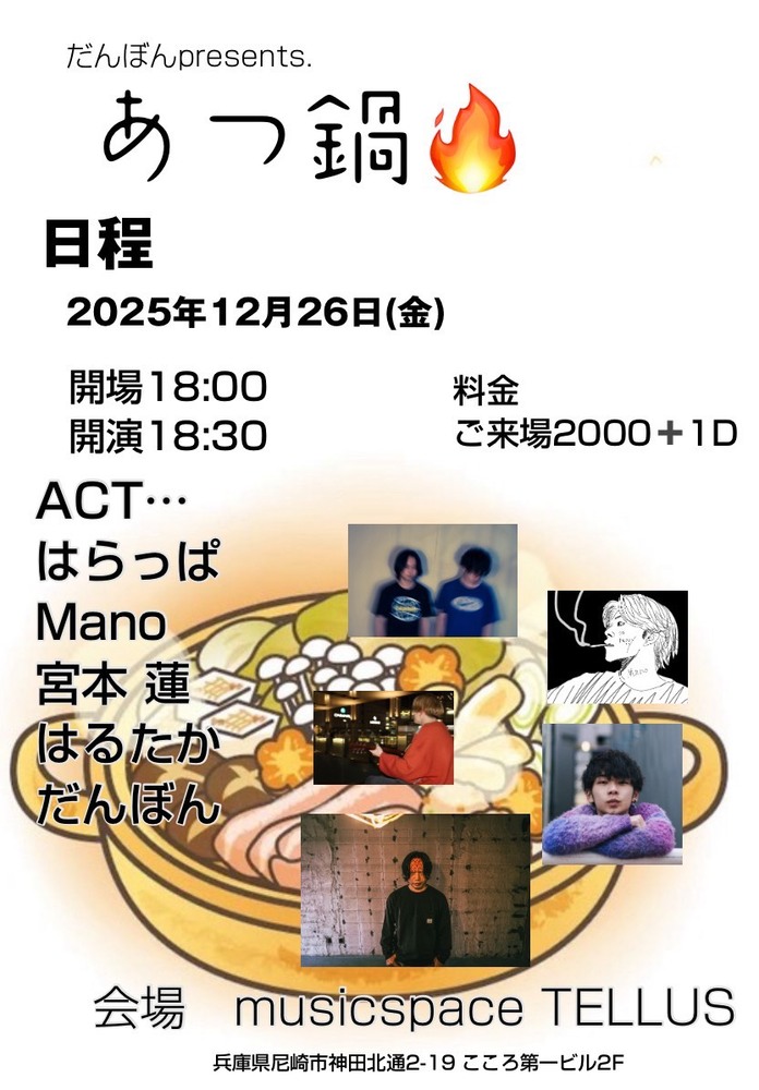 だんぼんpre.「あつ鍋」 SCHEDULE 2025/12/26(金) 18:00 - 2025年12月26日 (金) だんぼんpre.「あつ鍋」 ◇PLACE musicspace TELLUS ◇ACT だんぼん はるたか 宮本蓮 Mano はらっぱ ◇OPEN 18:00 ◇TICKET ¥2,000 ◇STREAMING OFFLINE URLをコピーする 報告する